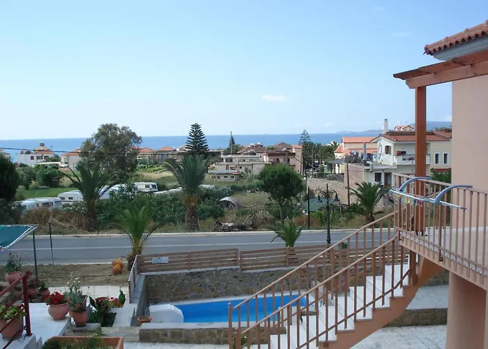 Die 40 m² große Ferienwohnung Chroma Finikounda liegt ungefähr 6 Fußminuten vom Foinikounda Strand sowie dem Atelier Sud entfernt und bietet Blick aufs Meer. Die Gäste können sich nach einem langen Tag in einem ganzjährigen Außenpool entspannen.